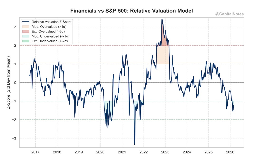 Financials were approaching -1.5σ on the relative valuation model. That puts them near their cheapest levels versus the S&P 500 since early-2022 and the 2020 COVID crash. The geopolitical selloff and the credit deterioration I flagged earlier have only deepened this discount.
