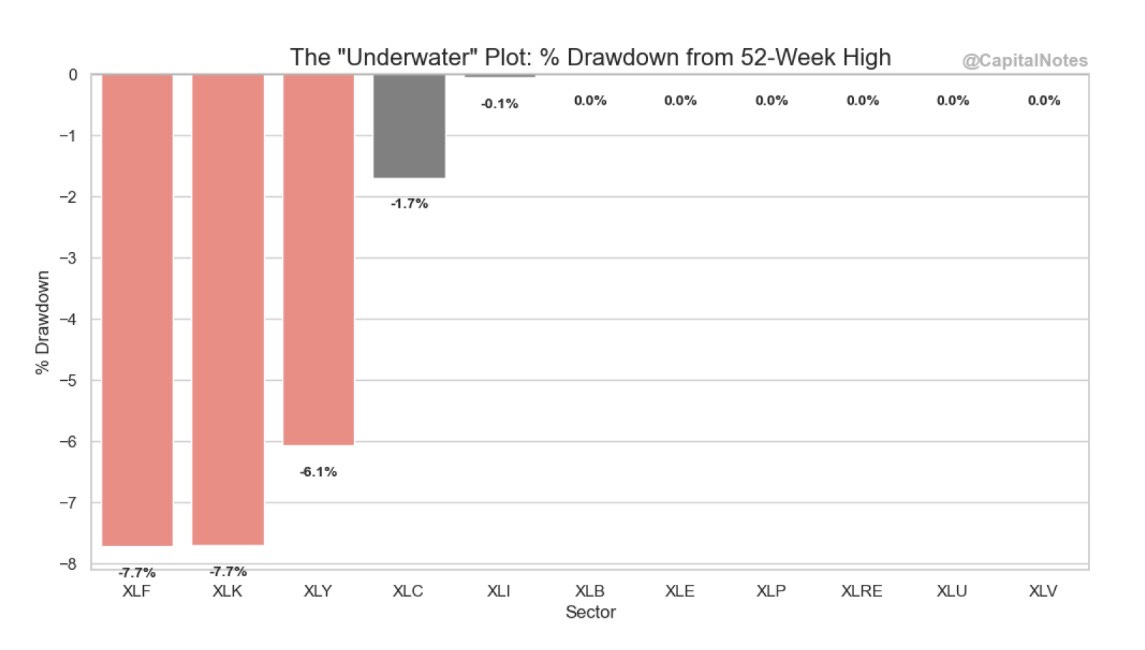 Figure 5 shows the “Underwater” plot and the equal-weight sector drawdown map, current as of today’s close.