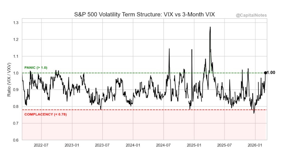 The ratio just hit 1.00, right at the panic threshold. Under normal conditions, this ratio trades below 1.0 because longer-dated volatility carries a premium (the term structure is in contango). When the ratio inverts to 1.0 or above, it means short-term fear has exceeded longer-term expectations. The VIX spiked to around 23-26 on Monday’s session.