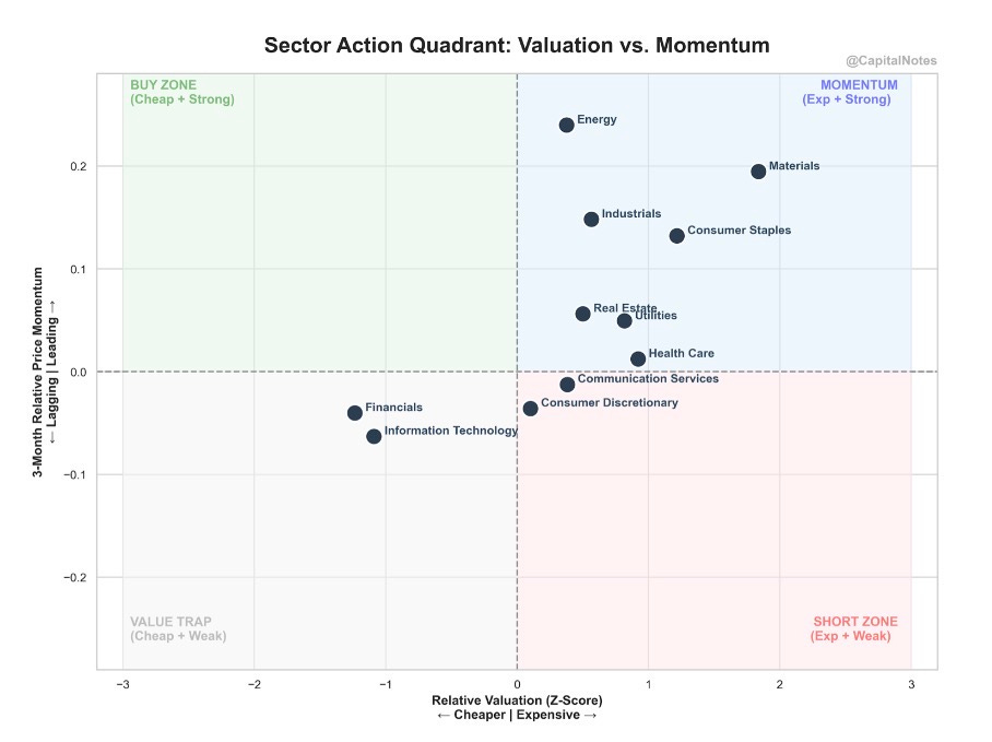 The upper right (Momentum) quadrant contains sectors that are expensive and strong: Energy and Materials sit here, benefiting from the commodity and geopolitical backdrop.