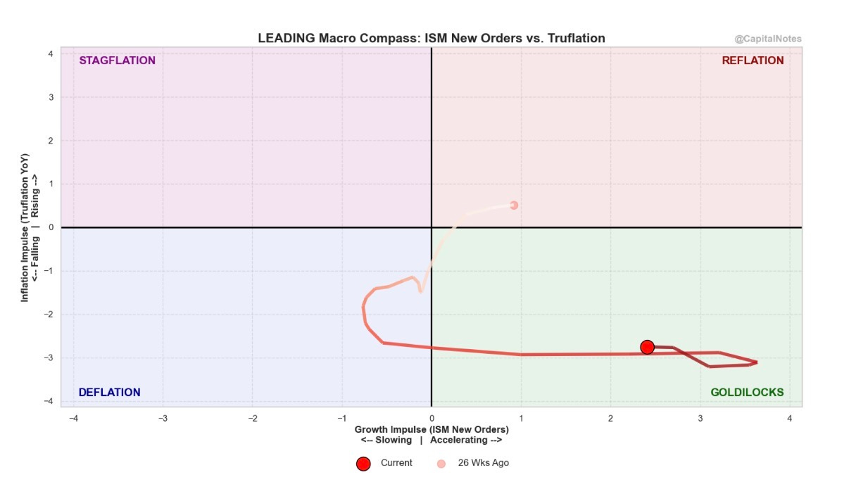 The current reading (dark red dot) sits deep in the Goldilocks quadrant: growth accelerating, inflation falling. Six months ago (the pink dot), we were in Reflation territory: growth was positive but inflation was still sticky. Over the following months, the path migrated left and down through the Deflation quadrant as growth slowed and prices began falling. Then, as ISM New Orders recovered and Truflation collapsed, the reading crossed right into Goldilocks, where it sits today.