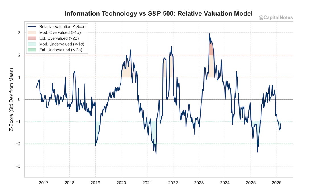 Tech’s relative valuation has compressed from +3σ in mid 2023 (extreme overvaluation) to nearly -1σ today (moderately undervalued). The last time Tech was this cheap relative to the broad market was during the “Liberation Day” sell off of 2025, just before the sector ripped higher.