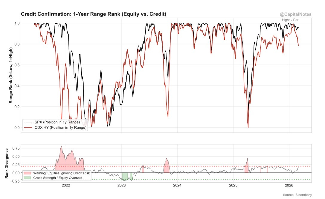 The bottom panel is the key. It measures the rank divergence between equities and credit. The red dotted line at 0.25 marks the warning threshold: above this level, equities are ignoring credit risk. We’re approaching that line.