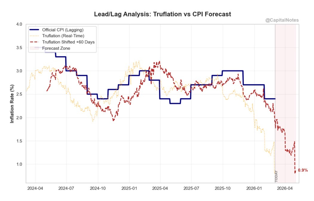 Truflation has collapsed to approximately 0.9% as of today. Some readings in early February hit as low as 0.68%. When I shift this series forward 60 days, the model suggests CPI could fall well below 2% in the months ahead, potentially approaching levels we haven’t seen since the pre-pandemic era.