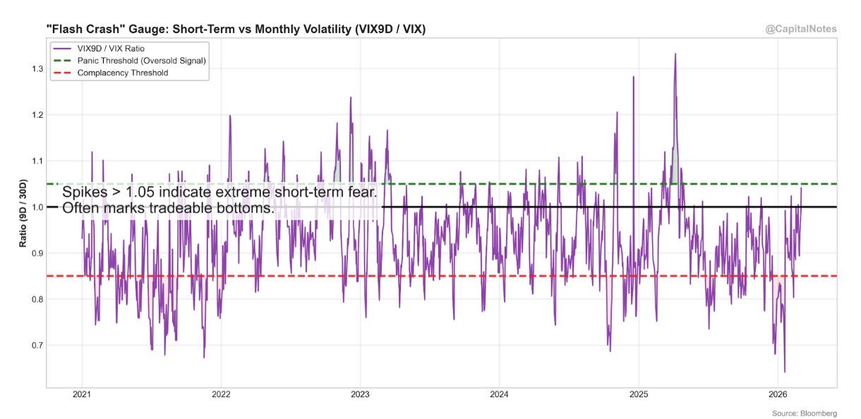 Spikes above 1.05 indicate extreme short-term panic. The chart’s own annotation notes that these readings “often mark tradeable bottoms.” We’re right at that zone. The pattern is clear across 2021 through 2026: sharp spikes in this ratio have consistently marked short-term fear extremes that preceded recoveries, not the beginning of extended declines.