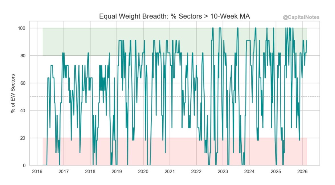 Even after the Iran strikes and this week’s volatility, over 90% of sectors remain above their 10-week MA. That is healthy. It’s the opposite of what we saw in late 2021 (when breadth deteriorated months before the 2022 bear market began) or in mid-2024 when the rally was increasingly concentrated in mega-cap tech. The market absorbed a geopolitical shock and breadth didn’t crack.