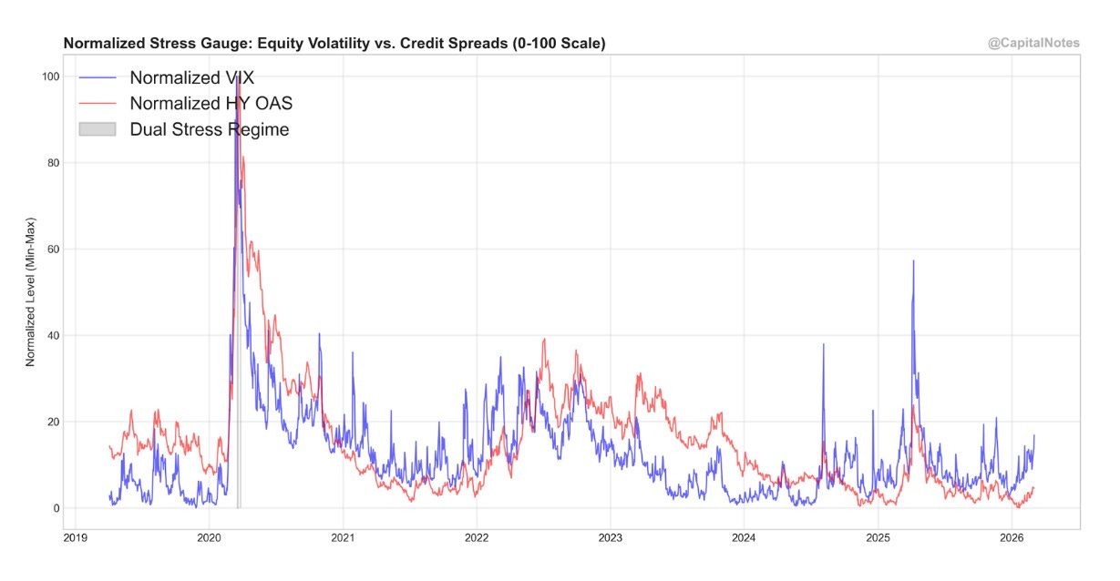 Figure 8 is the Normalized Stress Gauge, which plots the VIX (equity volatility, blue) against High Yield OAS (credit spreads, red) on a normalized 0-100 scale.