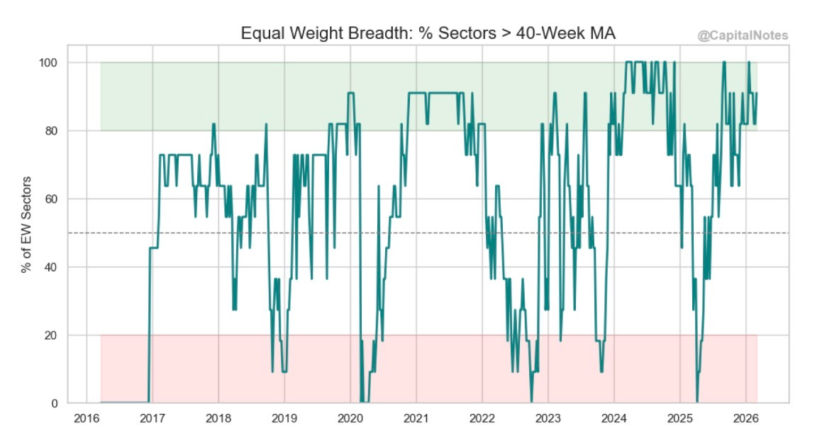 Same story. Roughly 90% of sectors remain above their 40-week MA. Compare that to early 2022 or late 2024 when this measure was deteriorating well before prices rolled over.
