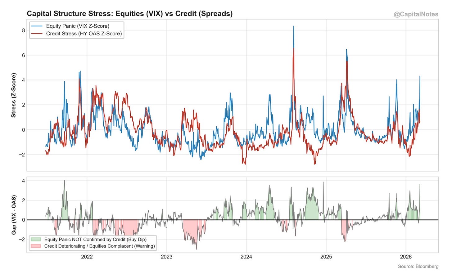 Capital structure stress tells a similar story, but not as negative. The VIX z-score (blue, equity panic) has spiked, while the HY OAS z-score (red, credit stress) has moved up but remains more contained.