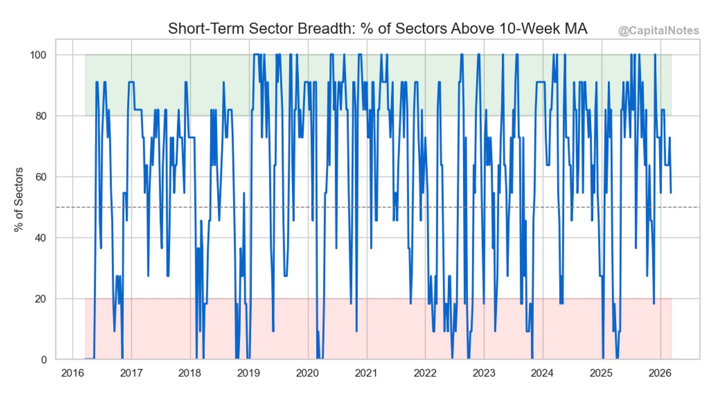 Zooming into the short-term picture, sector breadth measured against 10-week moving averages has declined but remains in the middle of its historical range. This isn’t the kind of washout we saw during prior panic episodes.