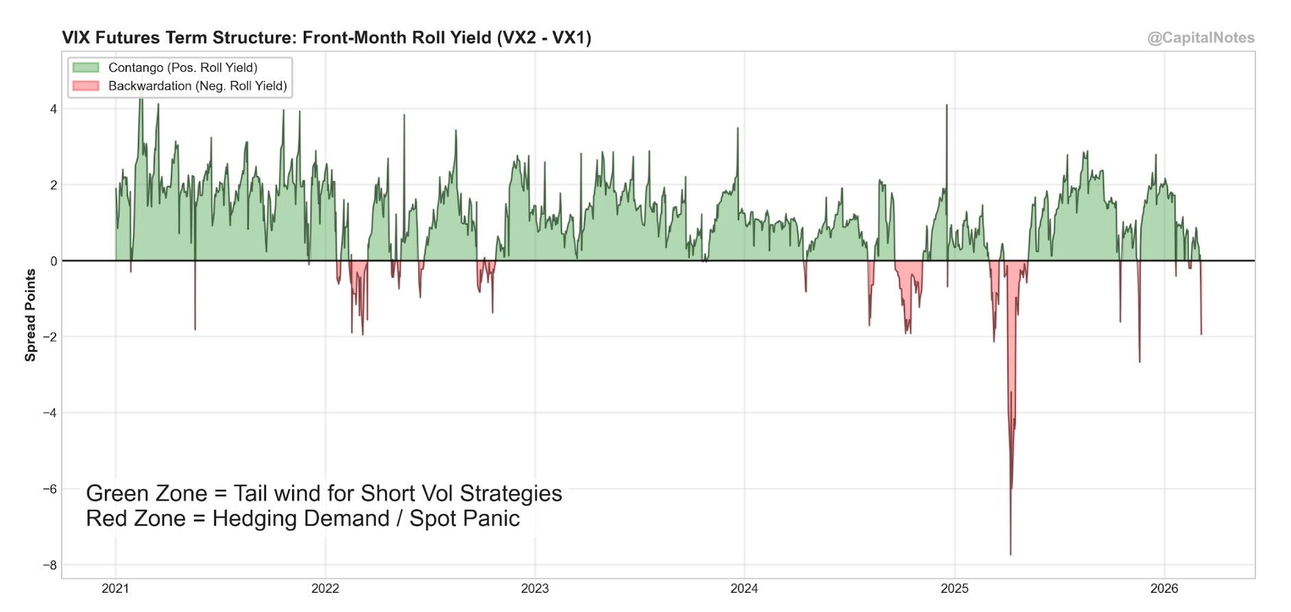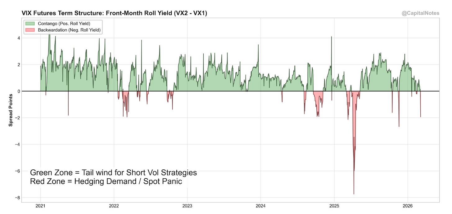 VIX futures roll yield has flipped negative (backwardation), meaning front-month futures are priced above second-month. The red zone on this chart represents hedging demand and spot panic.