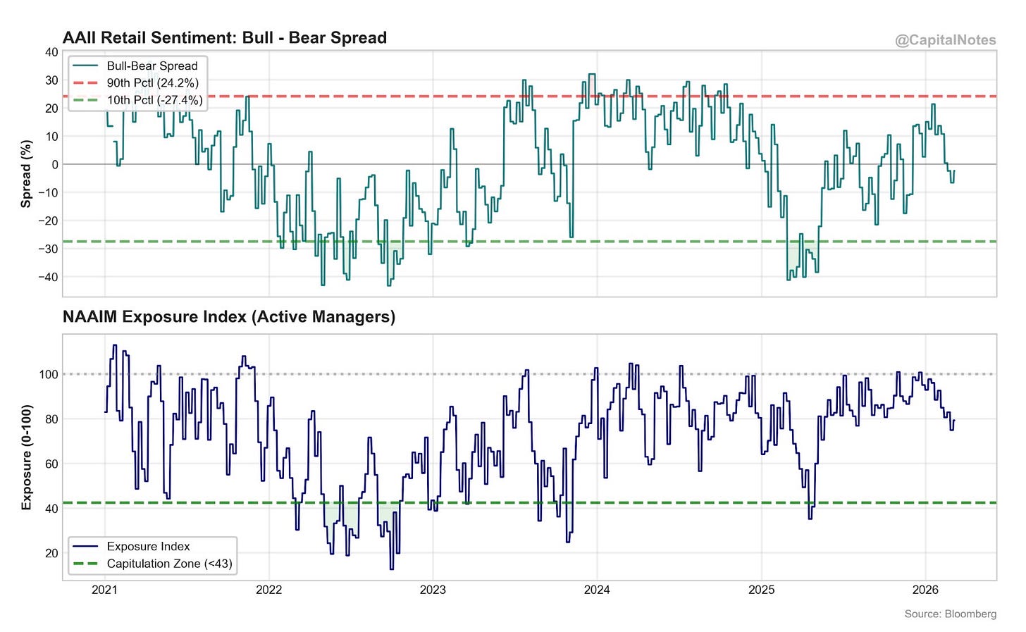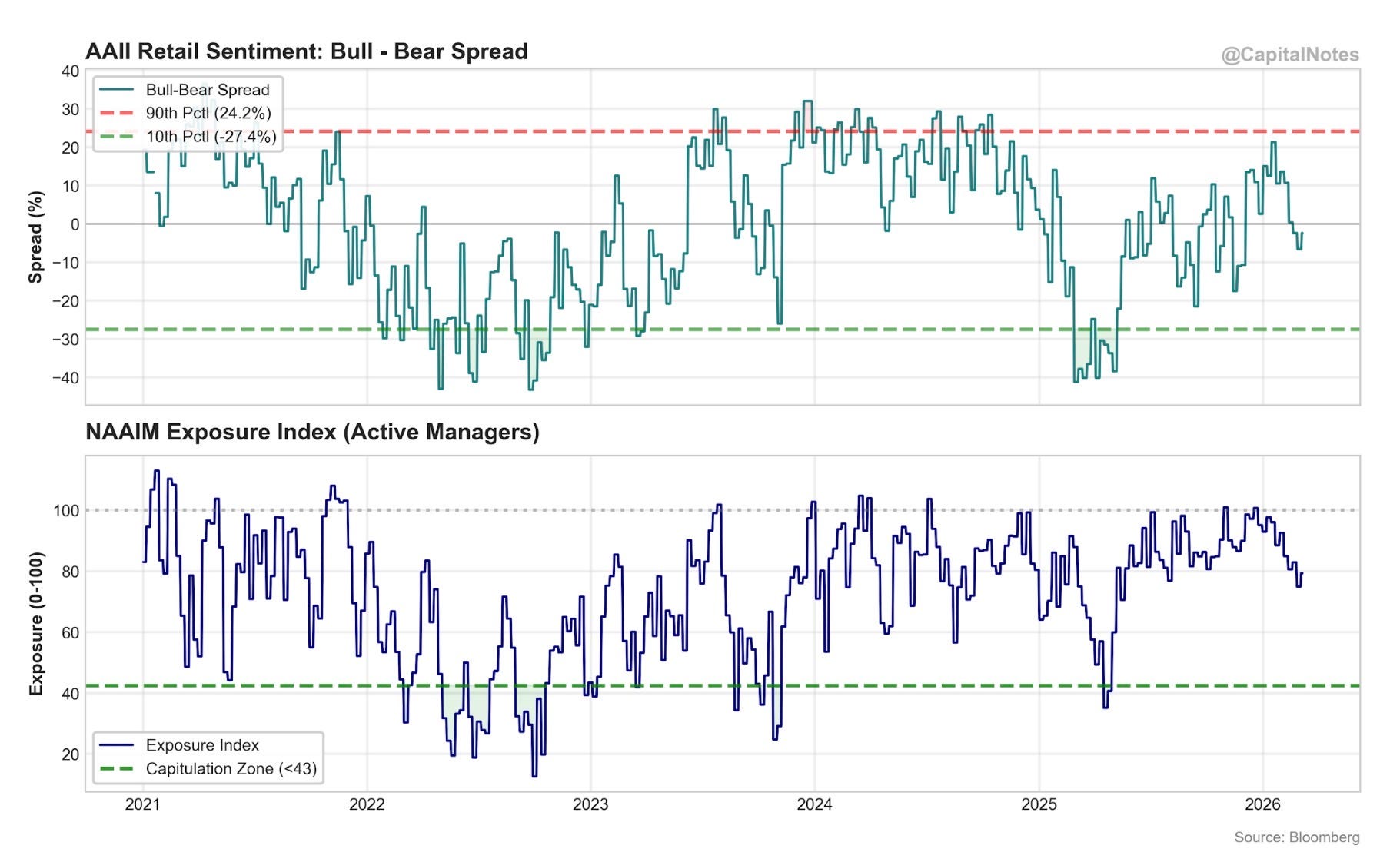 Active managers tell a similar story. The NAAIM Exposure Index has pulled back but remains well above the capitulation zone (below 43). Compare the current reading to mid-2022, when NAAIM briefly dipped below 20. That was capitulation. That was a “back up the truck” moment. We’re not there.