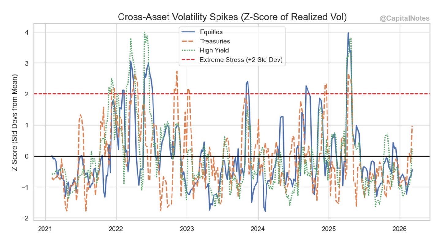 This chart tracks z-scores of realized volatility across equities (blue), Treasuries (orange), and high yield credit (green). The red dashed line at +2 standard deviations marks the “extreme stress” threshold.