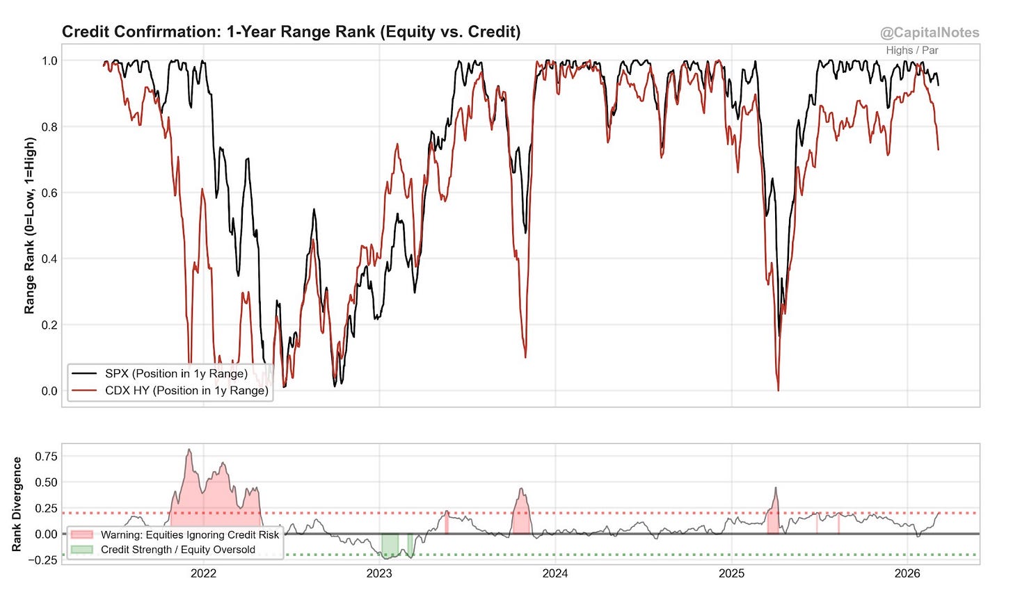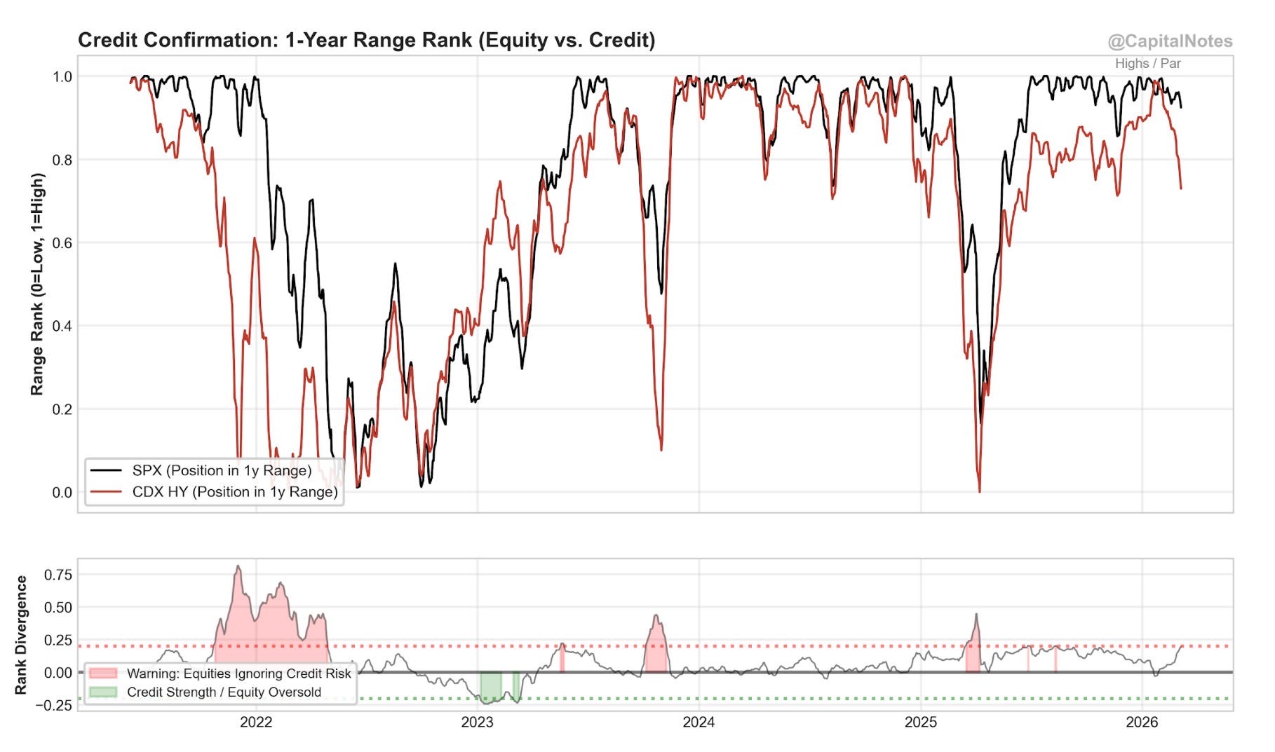 The top panel shows the 1-year range rank for both the S&P 500 (black) and CDX High Yield (red). Both have pulled back from their highs, with credit leading the way, but credit hasn’t yet collapsed the way it did in 2022.