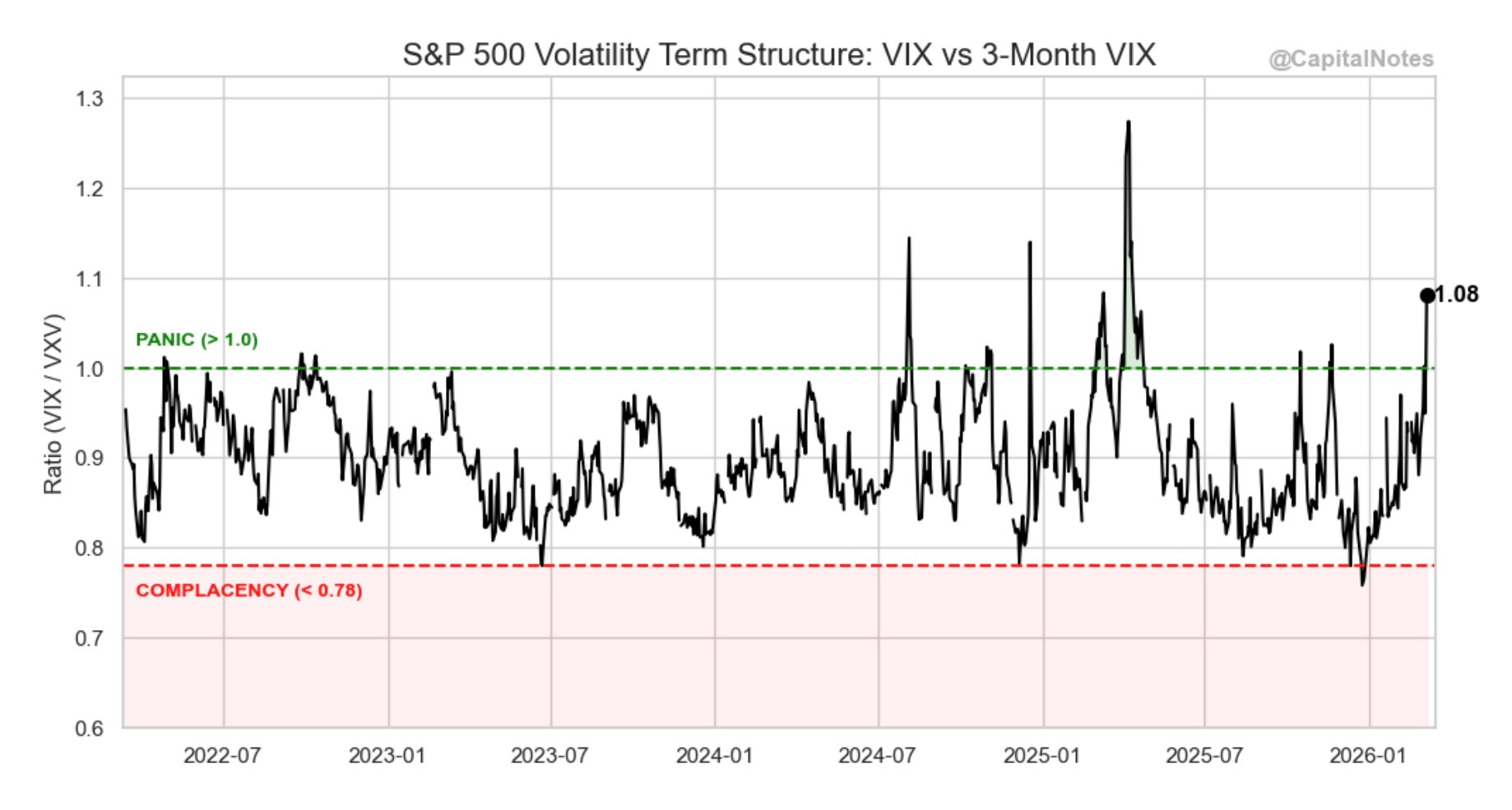 The VIX / VXV ratio just closed at 1.08. Anything above 1.0 signals panic. It means traders are paying more for short-term protection (30-day implied vol) than for longer-dated hedges (3-month implied vol). Fear is concentrated in the here and now.