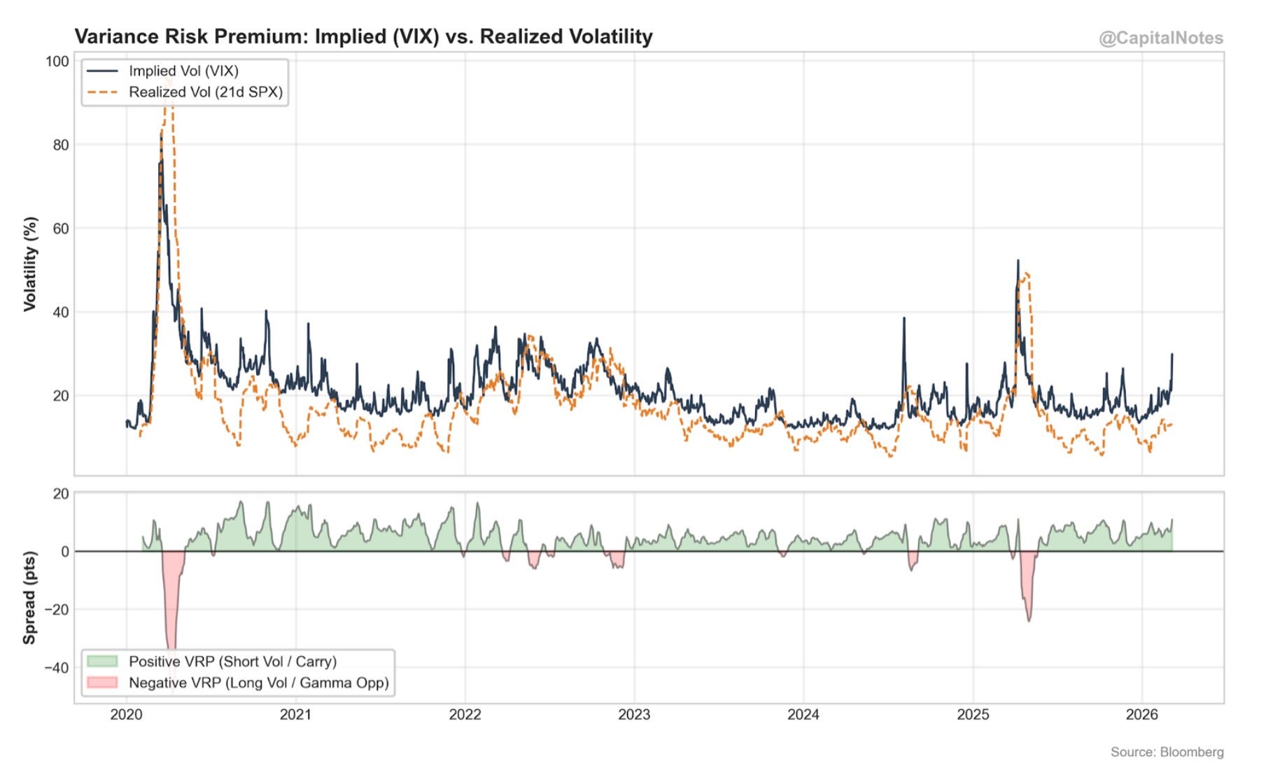 The variance risk premium (the spread between implied and realized vol) briefly went deeply negative in early 2025, meaning realized vol exceeded what the options market was pricing in. That’s rare and it’s painful for anyone short volatility.