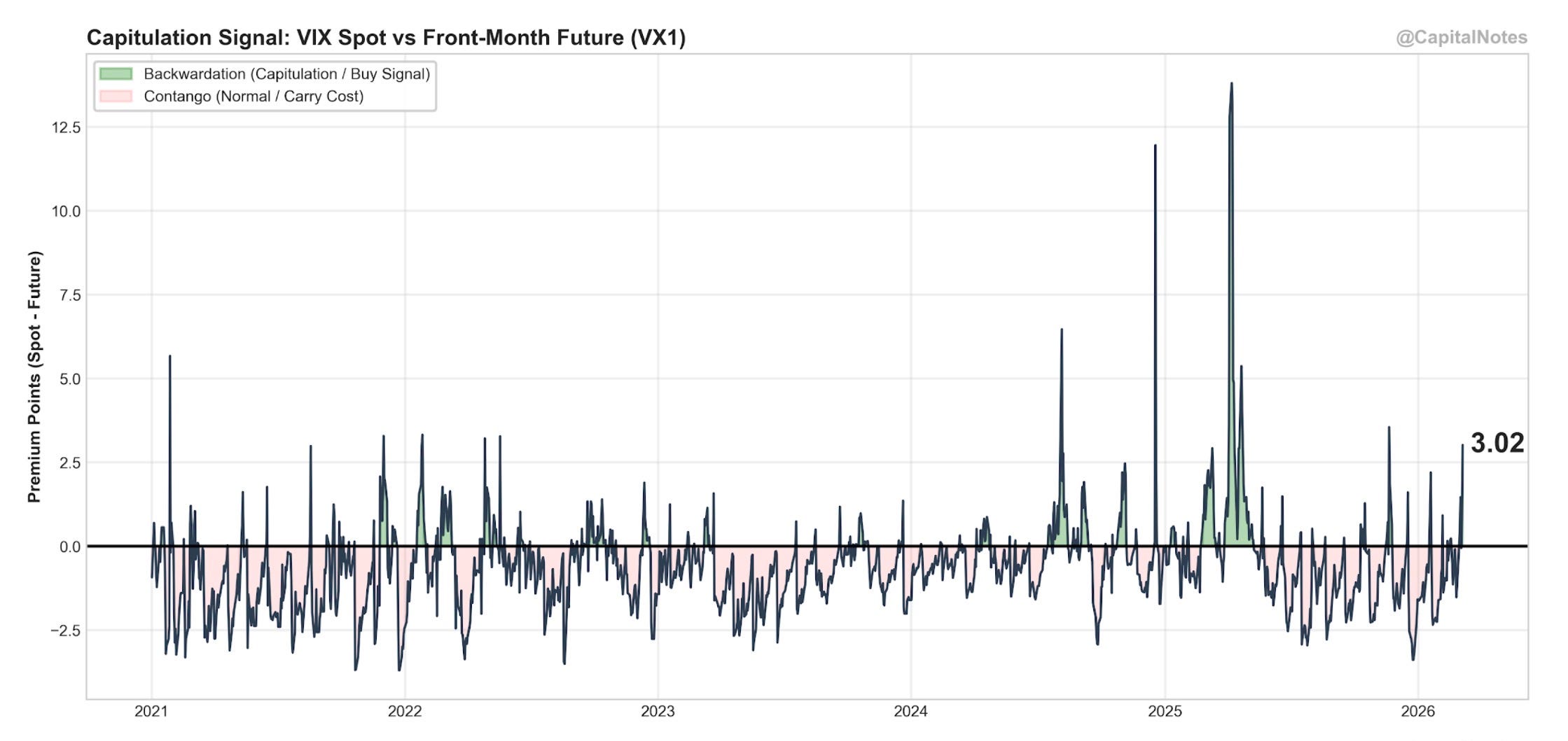 The VIX spot is trading at a 3.02 point premium to front-month futures. That’s significant backwardation. Historically, these spikes in the spot premium have often coincided with or preceded short-term bottoms.