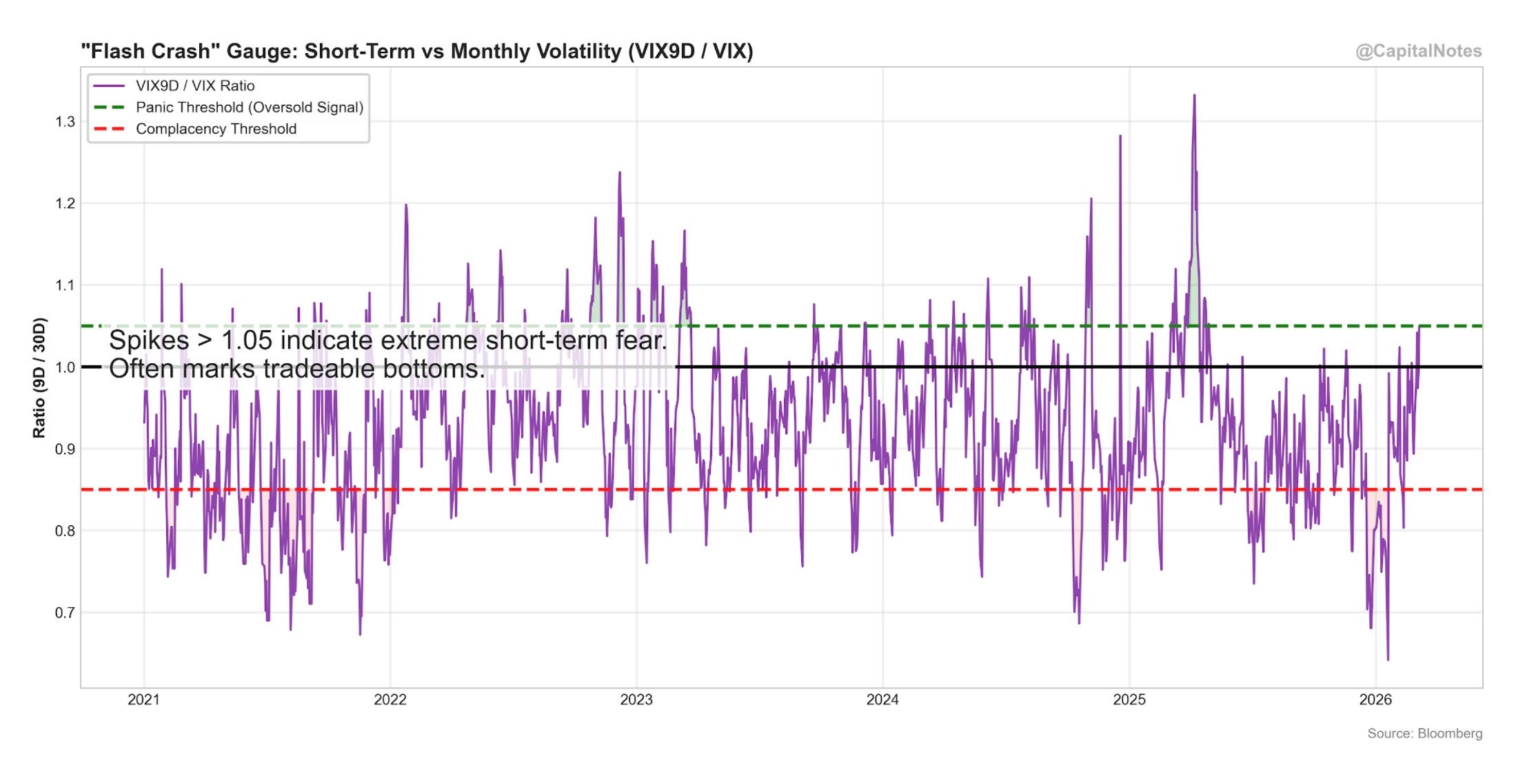 One more vol metric. The ratio of 9-day VIX to 30-day VIX is hovering near 1.0. When this ratio spikes above 1.05, it indicates extreme short-term fear and often marks tradeable bottoms. Below 0.85 signals complacency.