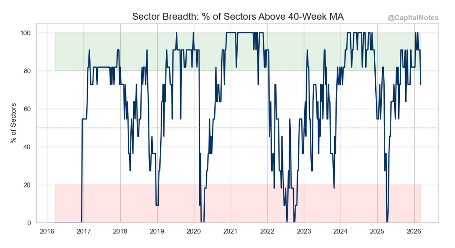 The percentage of sectors trading above their 40-week moving average has dropped sharply. But it hasn’t fallen into the pink “danger zone” below 20% that coincided with the 2020 crash, the 2022 bear market, and the mid-2025 tariff panic.