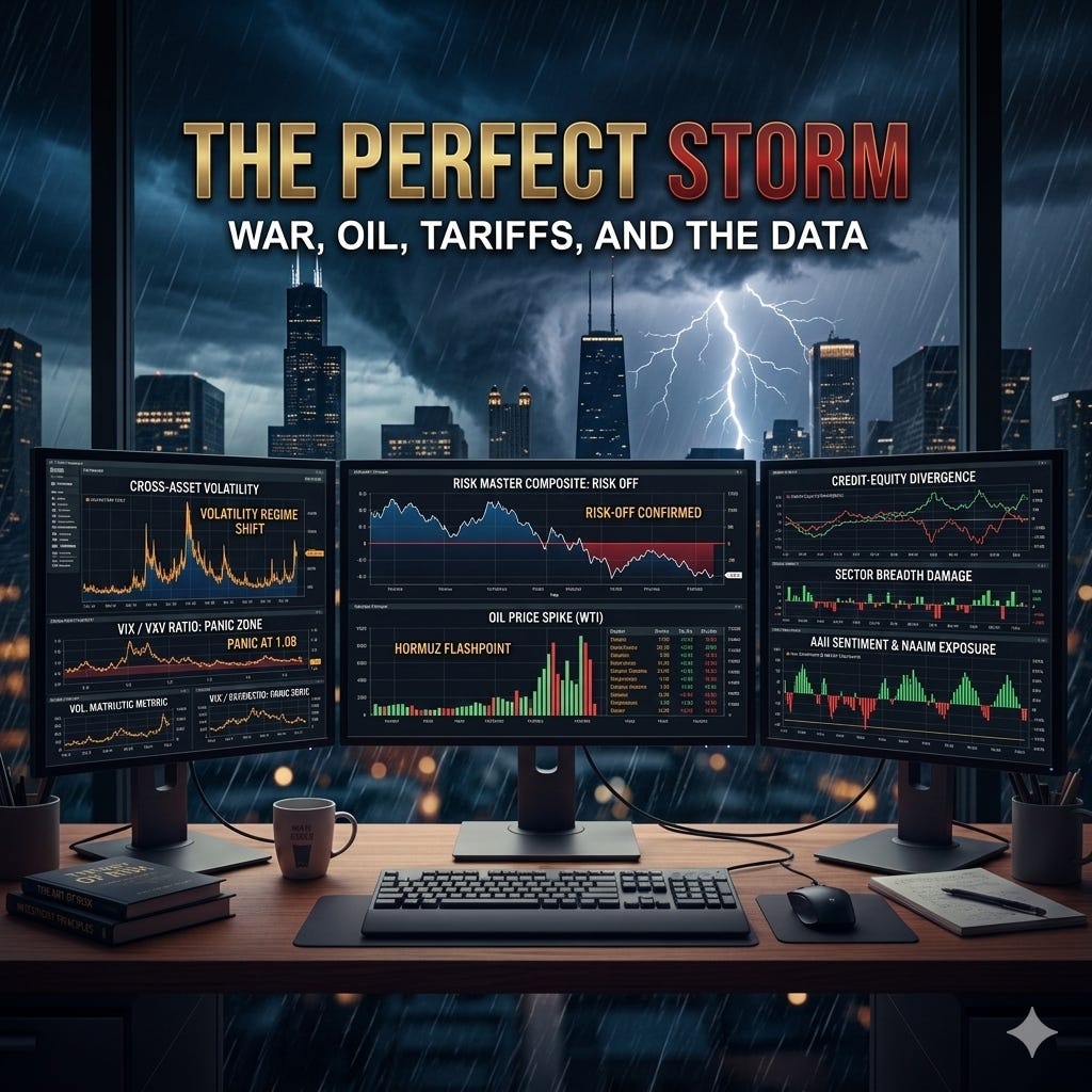 The regime has shifted. My Risk Master Composite just crossed into RISK OFF. Volatility is expanding but hasn’t reached coordinated extremes across asset classes. The term structure is in panic mode with the VIX/VXV ratio above 1.0 and futures in backwardation. But credit isn’t fully confirming a systemic event, yet. Breadth has weakened but hasn’t broken. And sentiment, while deteriorating, hasn’t reached the kind of despondent extremes that have historically marked the best buying opportunities.
