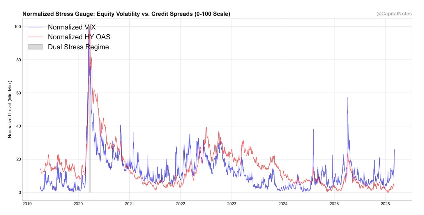 Normalizing both the VIX and HY OAS on a 0-100 min-max scale makes the divergence even clearer. The VIX has spiked, but credit spreads remain relatively well-behaved. No “dual stress regime” (gray shading) has been triggered in this view. The last time we saw a true dual stress event was the spring 2025 “Liberation Day” panic.
