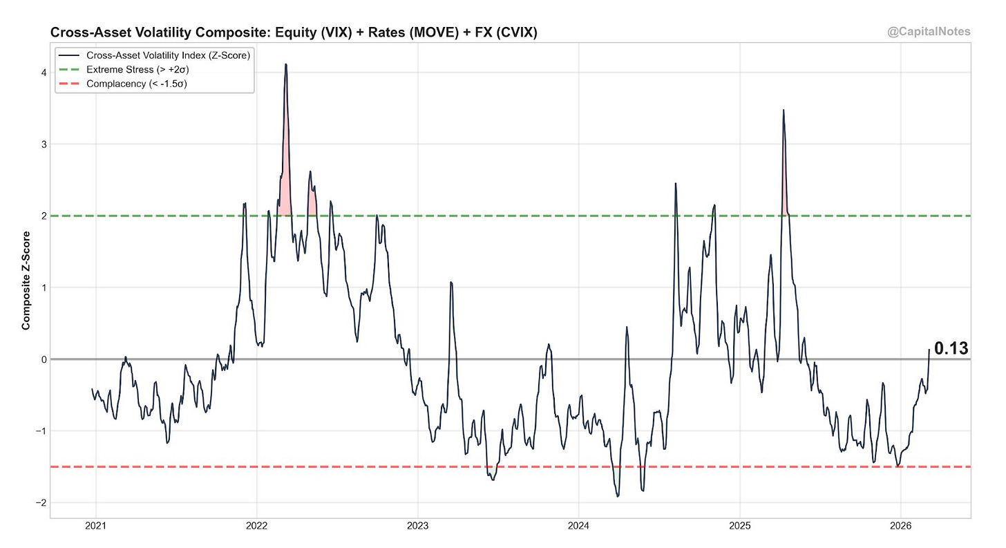 My Cross-Asset Volatility Composite, which combines equity (VIX), rates (MOVE), and currency (CVIX) volatility into a single z-score, currently reads 0.13.